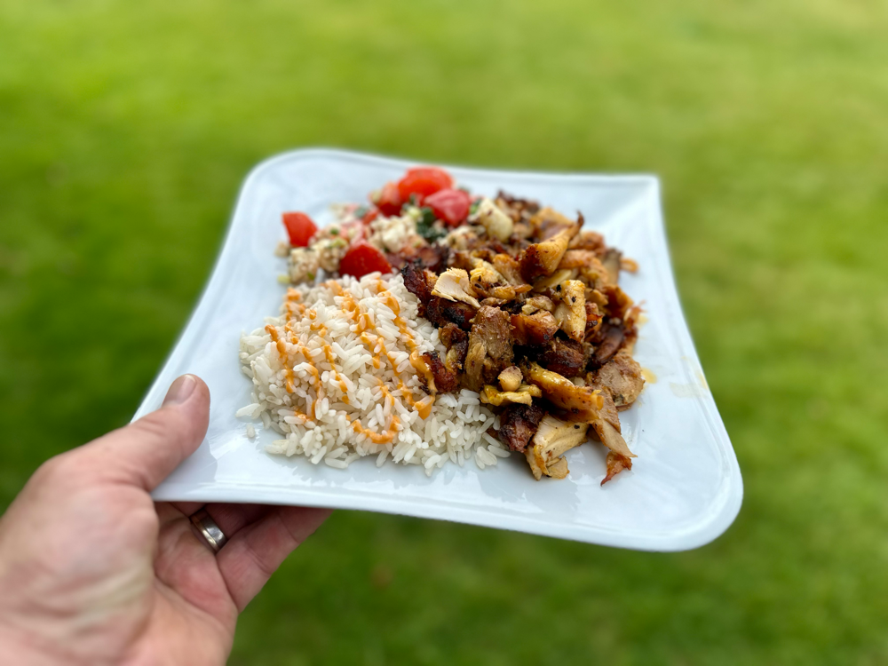 Es geht doch nichts über selbstgemachtes Hähnchen-Gyros. (Text und Bild kann Werbung enthalten) Dazu habe ich 3 kg ausgelöste Hähnchenkeulen (Pollo Fino) gekauft und mit einer Gyros-Gewürzmischung gewürzt. Den Spieß habe ich in den Halter von JTD gesteckt und das Fleisch aufgespießt. So kam der Spieß auf den Gasgrill und wurde vom Heckbrenner geröstet. Immer wenn es schön kross war, habe ich etwas heruntergeschnitten und vorne im Grill gesammelt, bis der Spieß leer war. Das Fleisch...