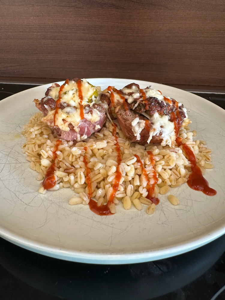 Kritharaki Bombe. (Text und Bild kann Werbung enthalten) Ich wollte mal wieder eine Bacon Bomb machen und da es letztens mit den Kritharaki-Nudeln in den Zwiebeln so lecker war, hatte ich die Idee eine Bomb damit zu füllen. Und so habe ich/wir es gemacht: Meine Frau hat einen Kritharaki-Salat gemacht, mit getrockneten Tomaten, Oliven und Pinienkernen. Eigentlich macht sie noch Feta oder Mozzarella mit rein, aber ich hatte Angst, dass die Bombe mit dem Käse zerläuft. Ich habe in der...